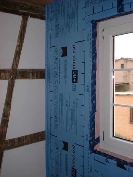 Die Luftdichtungsbahn wird untereinander und zu allen angrenzenden Bauteilen - Wände, Fenster, Durchdringungen - mittels Kleber oder Klebeband luftdicht verklebt.